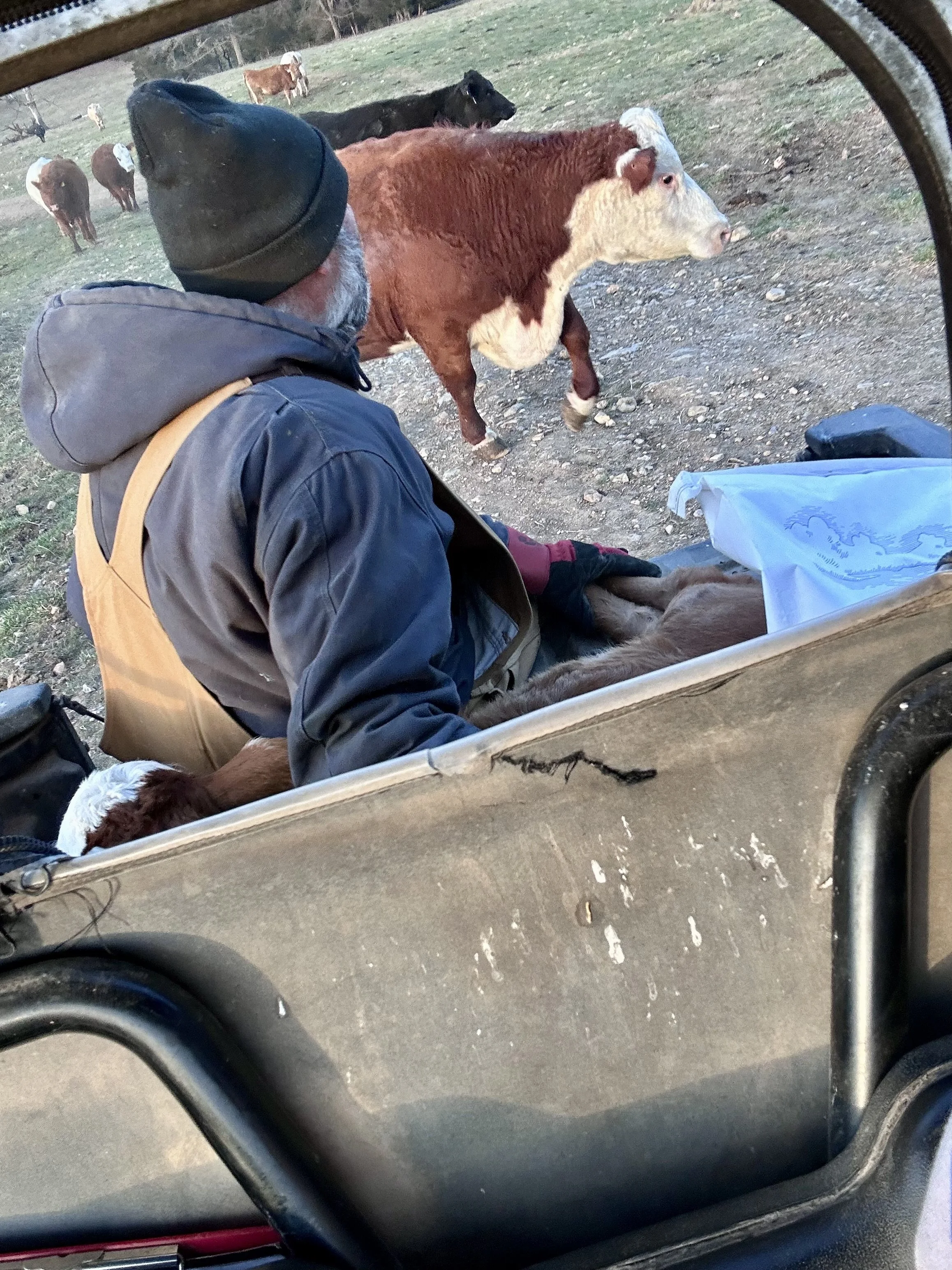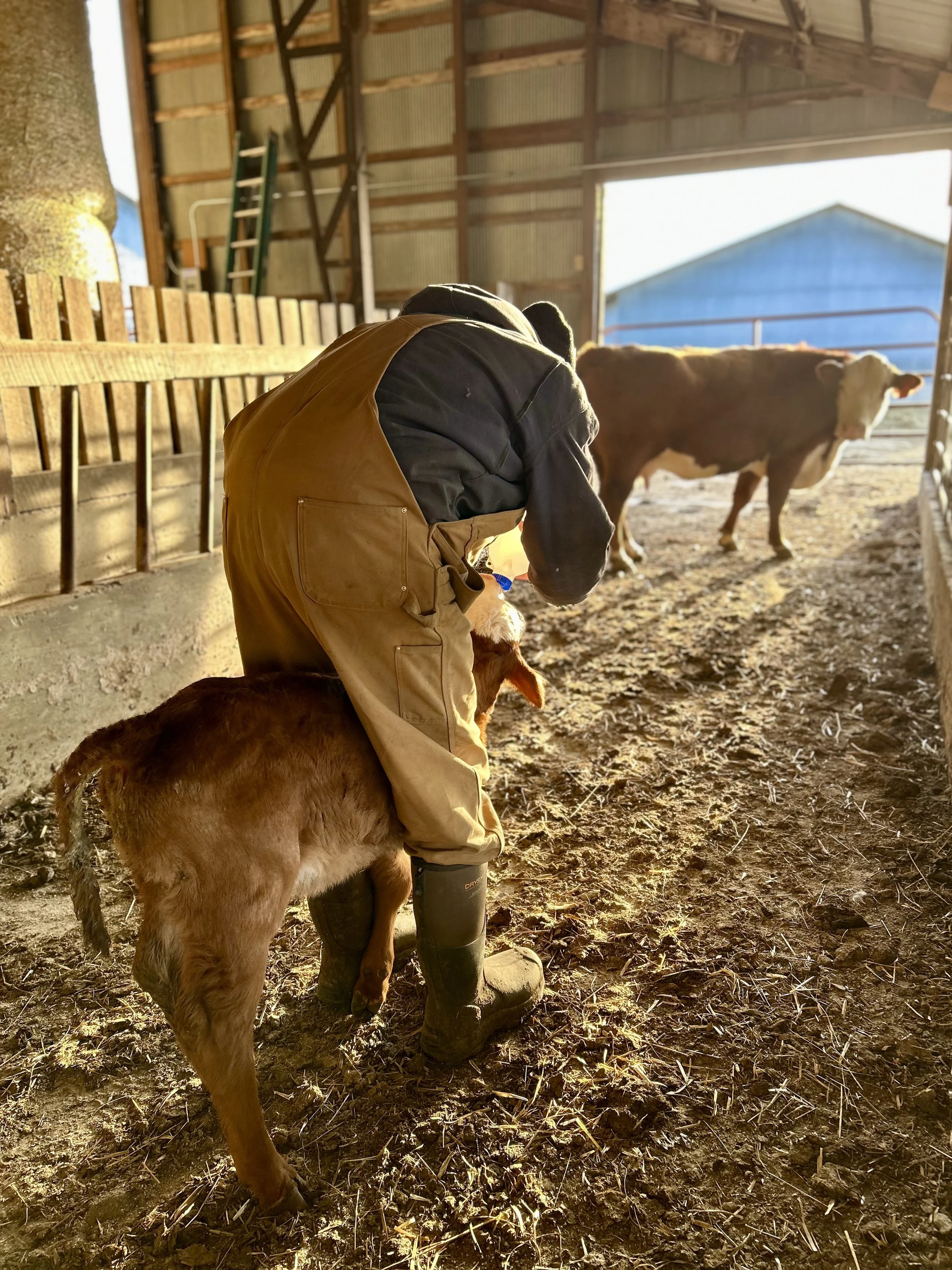 Sometimes the new calves get a little cough or scour. Helping this one out with some electrolytes to prevent dehydration. Having calm mamas is always helpful in these situations.