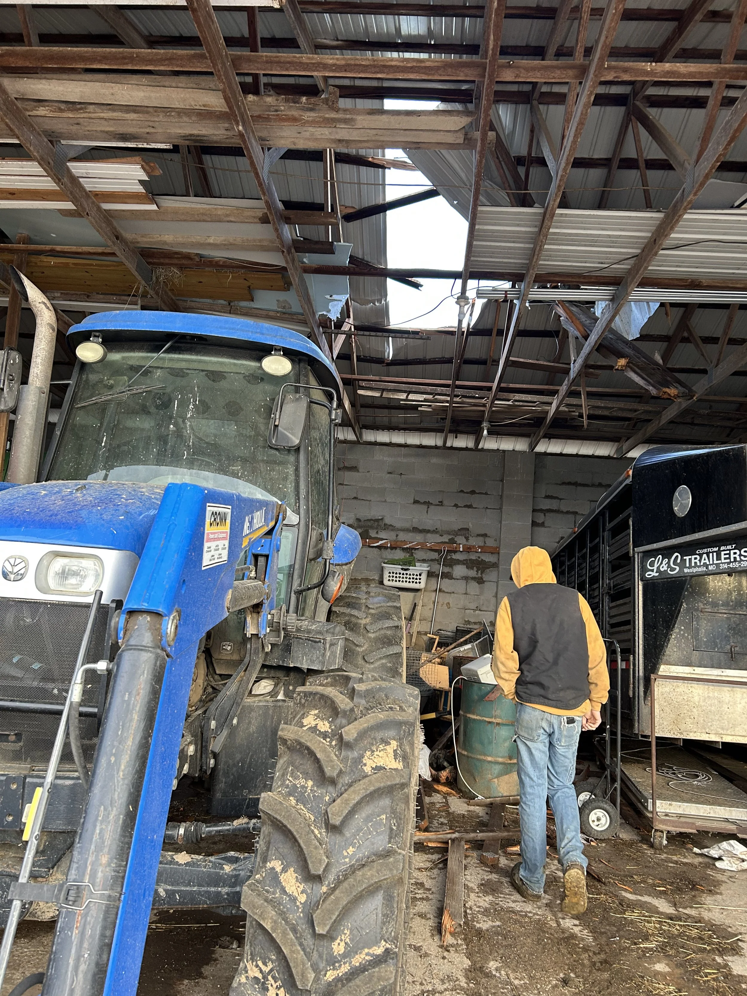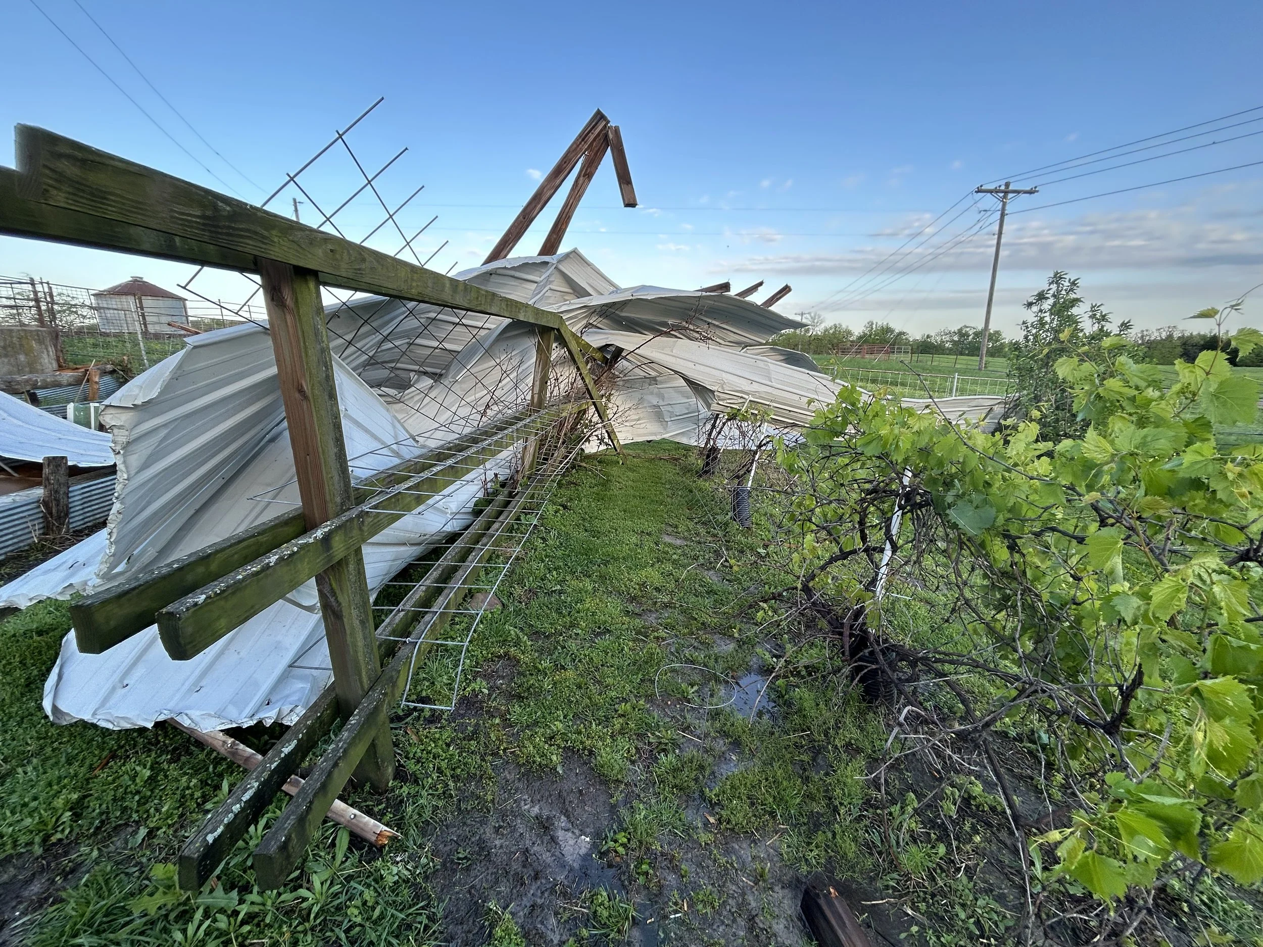 Lost half of our big hay barn- the tin and beams landed on another barn, camper, power lines, yard, apple trees, and vehicles.